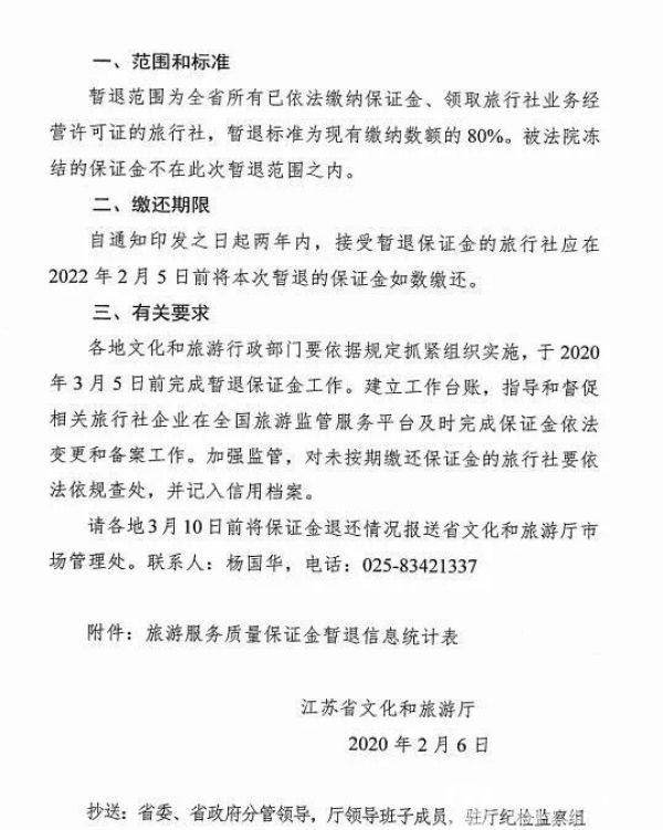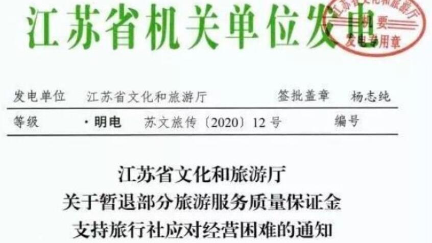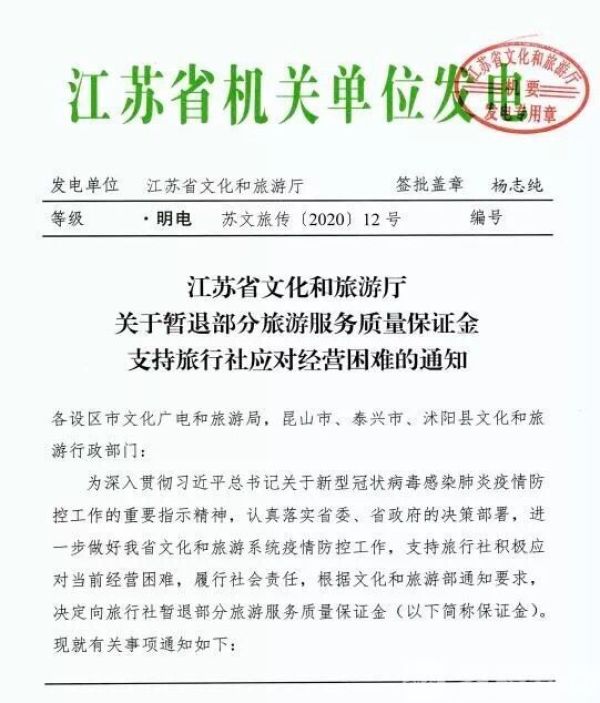 我苏网讯 为了进一步做好全省文化和旅游系统疫情防控工作,支持旅行社积极应对当前困难,履行社会责任。日前,江苏省文旅厅下发通知,决定向旅行社暂退部分旅游服务质量保证金。