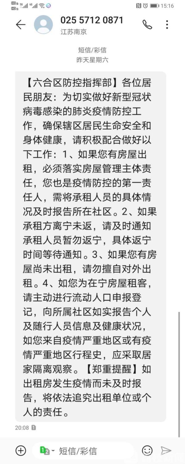 记者了解到,南京市、区房产局通过群发短信、微信群、电话以及租赁协会通知会员等多种途径,要求全市房屋出租人、住房租赁企业落实出租房管理主体责任,加强承租人员管理,限期报送所有承租人信息;对出租房发生疫情而未及时报告,告知其将依法追究责任。“房屋的产权是房主,如果在这个过程中没有及时通知承租人,或者把房子租给来自疫区人员,相关责任要由房主承担,在公告当中特别做了提醒。”南京六合区物业服务指导中心主任张成伟说。