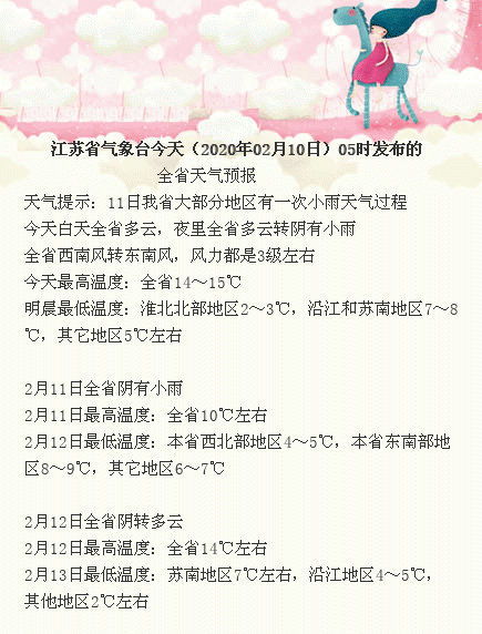 今天白天全省多云,夜里全省多云转阴有小雨,全省西南风转东南风,风力都是3级左右,今天最高温度:全省14~15℃,明晨最低温度:淮北北部地区2~3℃,沿江和苏南地区7~8℃,其它地区5℃左右。