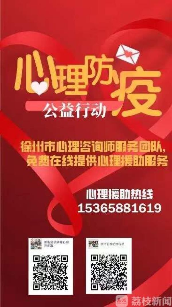 徐州市心理咨询师协会依据国家心理援助热线项目办制定的《心理援助热线对新型冠状病毒肺炎疫情心理干预手册》和国家卫生健康委员会疾控局下发的《新型冠状病毒感染的肺炎疫情紧急心理危机干预指导原则》开设了应对“新型冠状病毒”免费心理支持热线电话。同时组建社会危机心理干预志愿者服务队和心理咨询群,免费开展网上心理咨询。热线:15365881619