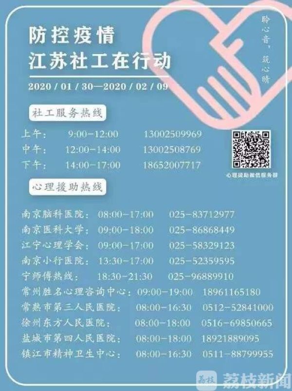 江苏省心理学会联合省内高校、专业机构等联合发起心理支持工作志愿者行动,开通抗击疫情心理援助热线,招募、遴选专业心理咨询人员并进行专业性培训,于2月3日起每天9:00-21:00值守热线,为需要心理支持的前线医护人员及其家属、隔离或留置观察人员、疑似或确诊人员及其他社会公众提供一对一心理咨询服务。热线:4008-513-885