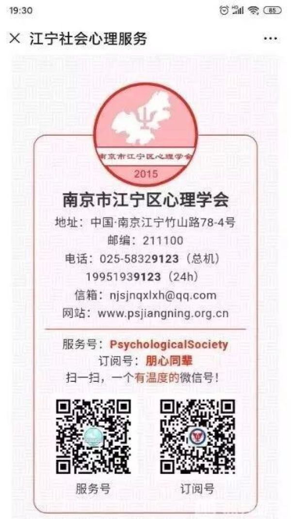 南京市江宁区心理学会组建心理咨询援助志愿服务队,每天9:00-17:00提供心理援助服务,同时线上评估疫情对当地市民心理健康状况的影响,原创《增强心理免疫能力,抗击新型冠状病毒》微信推文,针对普通公众、易感人群和医护人员等重点群体提出心理调适方法。热线:025-58329123、19951939123