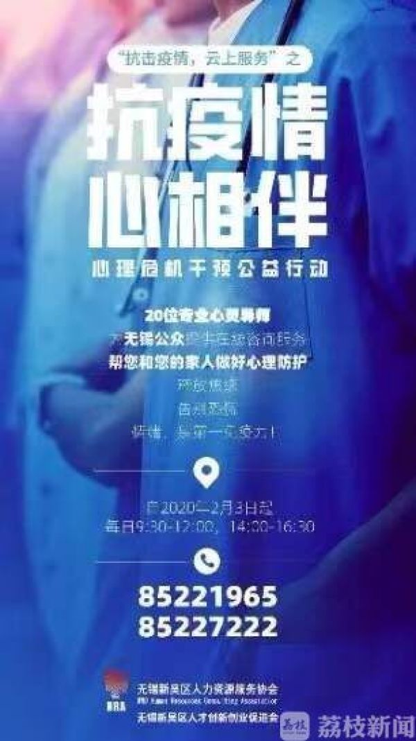 无锡新吴区人力资源服务协会、无锡新吴区人才创新创业促进会共同组建了“抗疫情,心相伴”志愿心理服务团队,20位专业人员自2月3日起每日9:30-12:00、14:00-16:30通过热线电话为需要的人员展开一对一心理危机干预。热线:0510-85221965、85227222