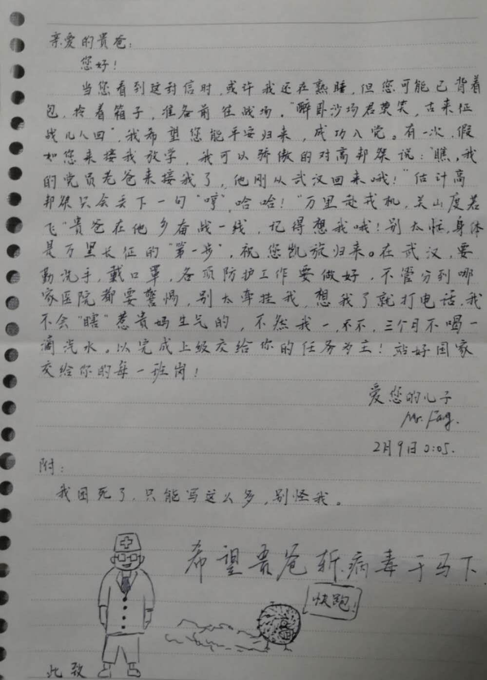 南京市中西医结合医院肺病科副主任医师方小谦出发前,儿子阿贵连夜写信为他送行!