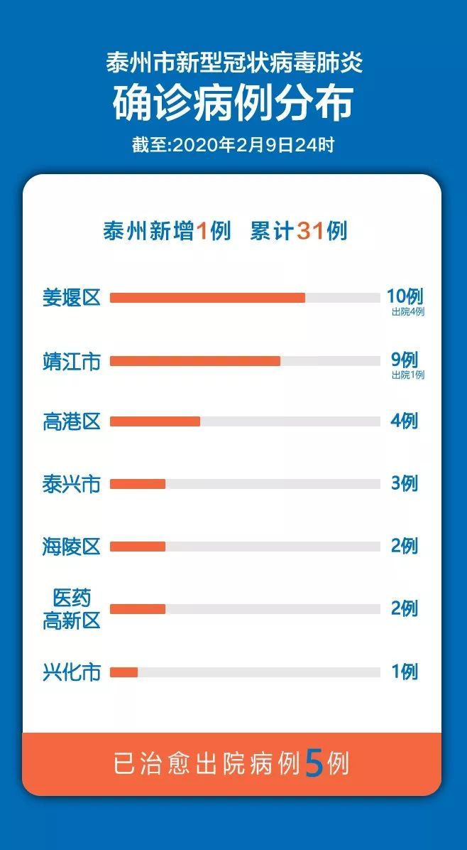 截至2月9日24时,泰州累计确诊新型冠状病毒肺炎患者31例,确诊病例中,靖江市9例、海陵区2例、高港区4例、姜堰区10例、泰兴市3例、泰州医药高新区2例、兴化市1例。治愈出院病例靖江市1例,姜堰区4例。