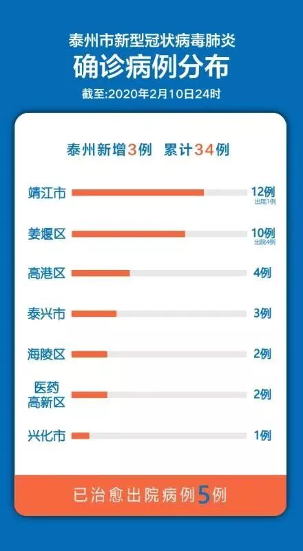 截至2月10日24时,泰州市累计确诊新型冠状病毒肺炎患者34例,确诊病例中,靖江市12例、海陵区2例、高港区4例、姜堰区10例、泰兴市3例、泰州医药高新区2例、兴化市1例。治愈出院病例靖江市1例,姜堰区4例。