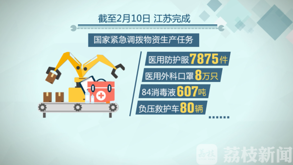 记者从省工信厅了解到,目前,我省医用口罩、医用防护服生产企业均已复工。 1月 26日,我省完成5000件防护服、3万箱84消毒液等国家紧急调拨物资。截至2月10日, 江苏又完成医用防护服7875件、医用外科口罩8万只、84消毒液607吨、负压救护车80 辆等国家紧急调拨物资的生产任务,全力支援重点地区疫情防控。
