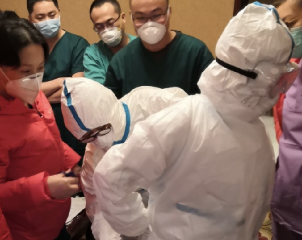 据悉,医疗队要求防护所有队员必须过关,现场设置了考核,队员们练完去考核,考核不过关接着练,“戴眼镜后戴护目镜再加一个面屏,手套戴三层,口罩戴两层,穿脱一次一个小时,全身都是汗”。范萍说,自己练两遍,再去感控那里练一遍,一个上午就过去了。