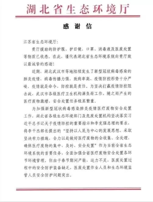 前不久,江苏省生态环境厅收到一封来自湖北省生态环境厅的感谢信。疫情发生后,得知湖北生态环境部门急需大量消毒液,江苏省生态环境厅连夜筹集5吨辗转千里运抵武汉。此外,还筹集一体防护服1512套、医用手套1000副、进口活性炭口罩1000个、医用一次性口罩5000个、护目镜200副等紧缺物资驰援。关键时刻雪中送炭,不禁叫人肃然起敬。