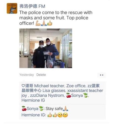 查控工作结束后,史叶锋匆匆带上5个自备口罩以及水果送到Floyd家中,向他详细介绍了口罩购买渠道,并叮嘱他近期减少外出次数,照顾好自己。