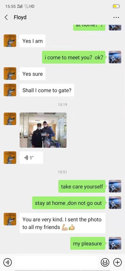 Floyd告诉史叶锋,家里储存的食物已经全部吃完,想到小区门口的超市买点食物,却因没有戴口罩被拦在超市门外,希望史叶锋能够帮助他。了解情况后,史叶锋立即联系到超市工作人员,先由超市送给Floyd一个口罩,让他顺利买到食物。