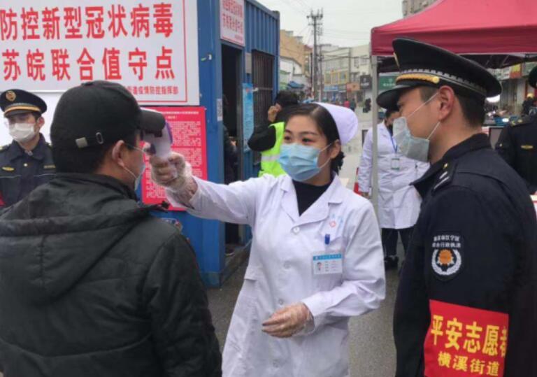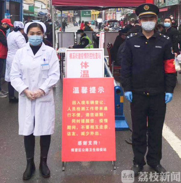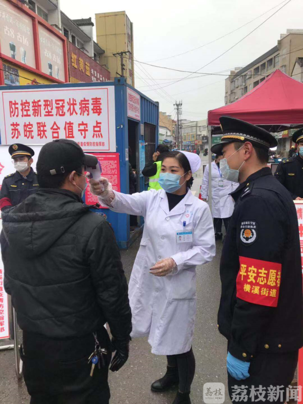 作为苏皖两省交界的横溪街道,疫情防控面广量大,交汇点设卡成为了重中之重,夫妻两人自发申请在一线上岗,做好人员登记、量体温、排查外来人员等工作。