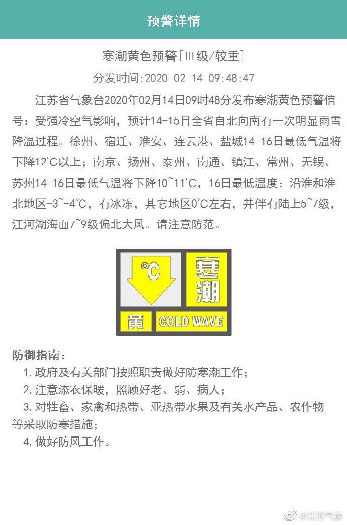 我苏网讯 据江苏气象消息,江苏省气象台2020年02月14日09时48分发布寒潮黄色预警信号:受强冷空气影响,预计14-15日全省自北向南有一次明显雨雪降温过程。徐州、宿迁、淮安、连云港、盐城14-16日最低气温将下降12℃以上;南京、扬州、泰州、南通、镇江、常州、无锡、苏州14-16日最低气温将下降10~11℃,16日最低温度:沿淮和淮北地区-3~-4℃,有冰冻,其它地区0℃左右,并伴有陆上5~7级,江河湖海面7~9级偏北大风。请注意防范。
