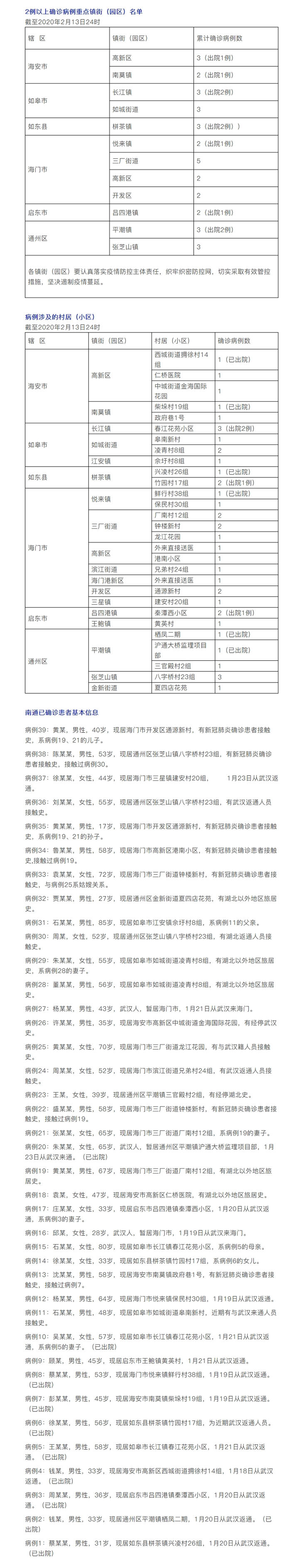 截至2月13日24时,南通市累计报告新型冠状病毒肺炎确诊病例39例,其中,普通型病例38例,重型病例1例,出院病例10例。确诊病例中,海安市5例(高新区3例、其中出院1例,南莫镇2例、其中出院1例),如皋市7例(长江镇3例、其中出院2例,如城街道3例、江安镇1例),如东县3例(栟茶镇3例,其中出院2例),海门市14例(悦来镇2例、其中出院1例,高新区2例、三厂街道5例、滨江街道1例、海门港新区1例、开发区2例、三星镇1例),启东市3例(吕四港镇2例、其中出院1例,王鲍镇1例),通州区7例(平潮镇3例、其中出院2例,张芝山镇3例、金新街道1例)。