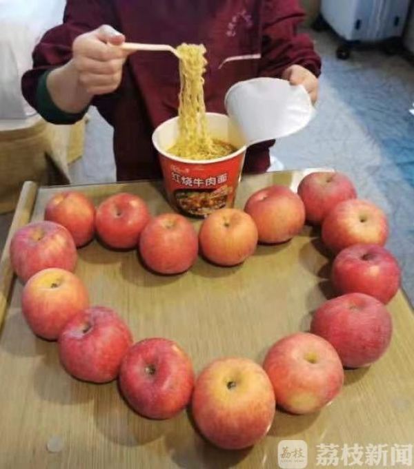 ▲队友用苹果摆成爱心的形状,并叮嘱倪萍萍过生日记得吃面