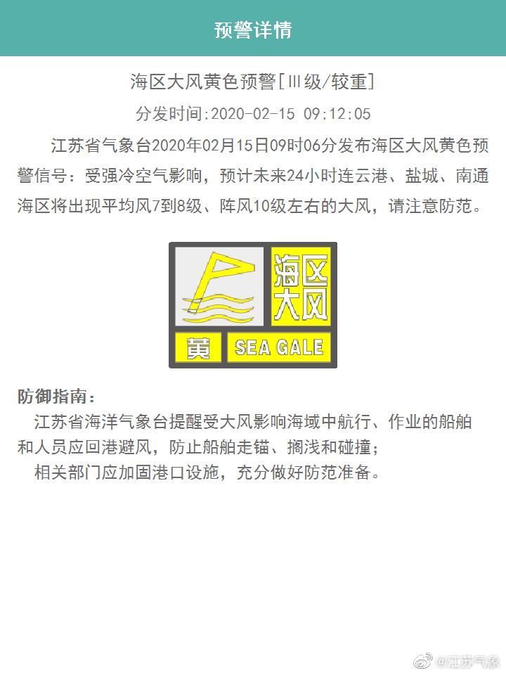 09时06分,江苏气象台发布海区大风黄色预警信号:受强冷空气影响,预计未来24小时连云港、盐城、南通海区将出现平均风7到8级、阵风10级左右的大风,请注意防范。