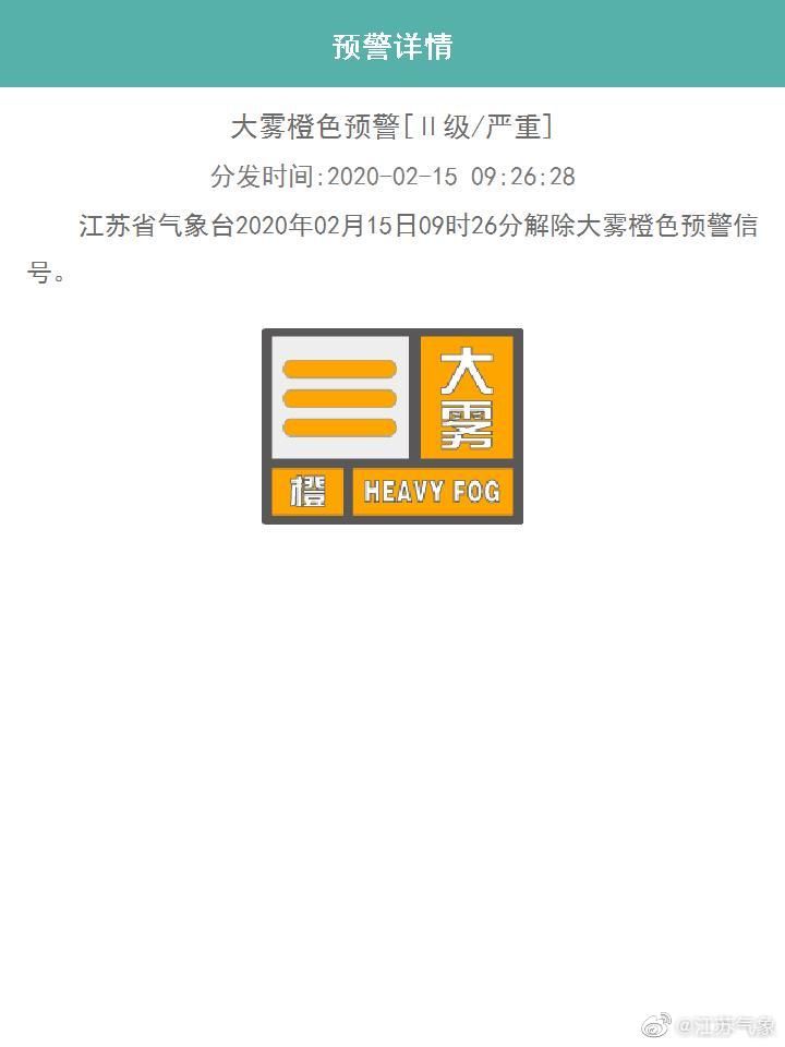 我苏网讯 江苏省气象台2020年02月15日09时26分解除大雾橙色预警信号。