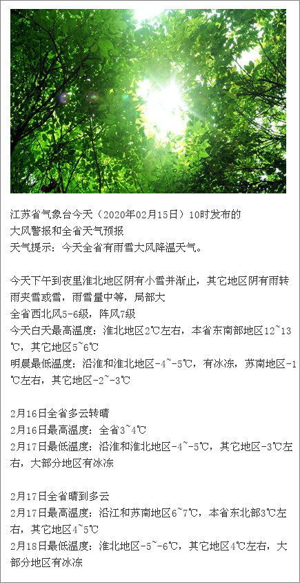 今天下午到夜里淮北地区阴有小雪并渐止,其它地区阴有雨转雨夹雪或雪,雨雪量中等,局部大,全省西北风5-6级,阵风7级,今天白天最高温度:淮北地区2℃左右,本省东南部地区12~13℃,其它地区5~6℃,明晨最低温度:沿淮和淮北地区-4~-5℃,有冰冻,苏南地区-1℃左右,其它地区-2~-3℃。