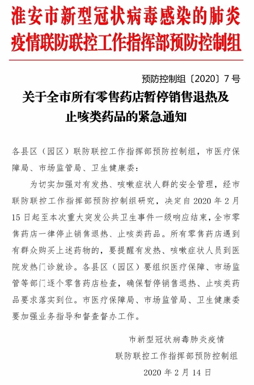 记者从淮安市新型冠状病毒肺炎疫情联防联控工作指挥部预防控制组了解到,自2020年2月15日起至本次重大突发公共卫生事件一级响应结束,全市零售药店一律停止销售退热、止咳类药品