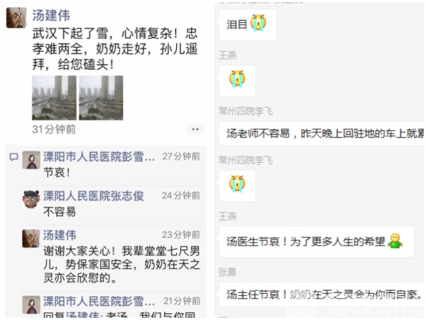 2月15日,正在武汉方舱医院工作的溧阳人民医院消化内科副主任医师汤建伟接到家里来电,奶奶过世了。得知噩耗,汤建伟站在窗边,心情久久不能平复。他不愿多说,抹去泪水,在朋友圈写下这么一段话: