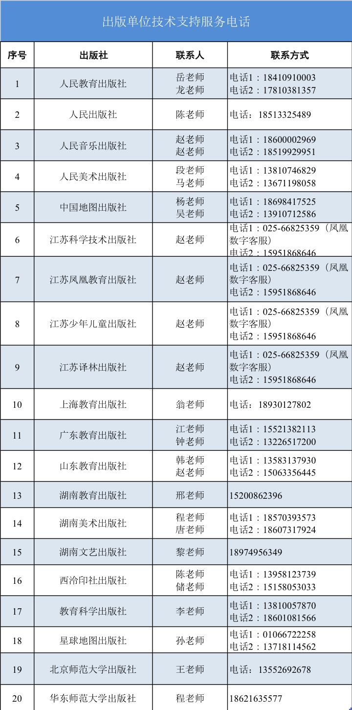 依据教育部《关于认真做好疫情防控期间教学用书供应工作的通知》和《关于发布中小学国家课程教材电子版链接的通告》要求,针对江苏省内中小学所使用的教材,江苏省决定公布各教材编写出版单位提供的免费电子版教材链接、教材出版单位技术支持服务电话(具体见下方二维码和图表)。
