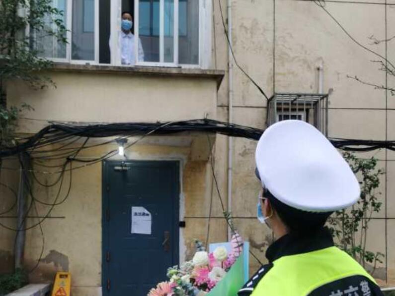 今天下午3点,姜康康手捧鲜花在医院和大队领导的陪同下来到省人民医院6号楼楼下,这栋三层小楼位于医院深处,也正是发热患者隔离观察的专属区域。隔离病房属于“污染区”,里面的人员均须集中隔离14天后才能重获“自由”。5分钟后,陆艳艳出现在了二楼窗户,虽然两人只有近10米的距离,但这是近一个月来,两人靠得最近的一次。