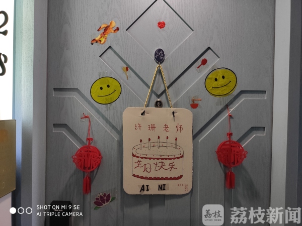 为缓解压力,东海“五朵金花”在工作中相互鼓励,生活中互相帮助。“来的时候,我拿到了我们成员名单,查看一下,今天正好是许珊老师39岁生日。”吴倩倩说,“我就想给许老师过个生日,把她房间门布置喜庆点,给她一个意外的惊喜。”这个想法得到其他三位同事的一致响应。为能及时掌握各自的想法,吴倩倩还建了“临时秘密小分队群”,并当起了“导演”。条件有限,创意无限,她们用桶装方便面的包装箱做成生日贺卡,在背面画了一个蛋糕,并在蛋糕底部写上“生日快乐”四个字,蛋糕上面画了五根燃烧着的蜡烛。“这五根蜡烛,代表着我们五姐妹心连心,肩并肩。”