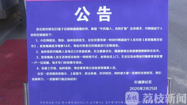 记者了解到,东方天郡所在社区早在25日就在小区门前张贴了公告,要求小区内的每名从韩国返宁人员进行14天的居家隔离。同时,物业对其居住的楼道进行定期消杀。