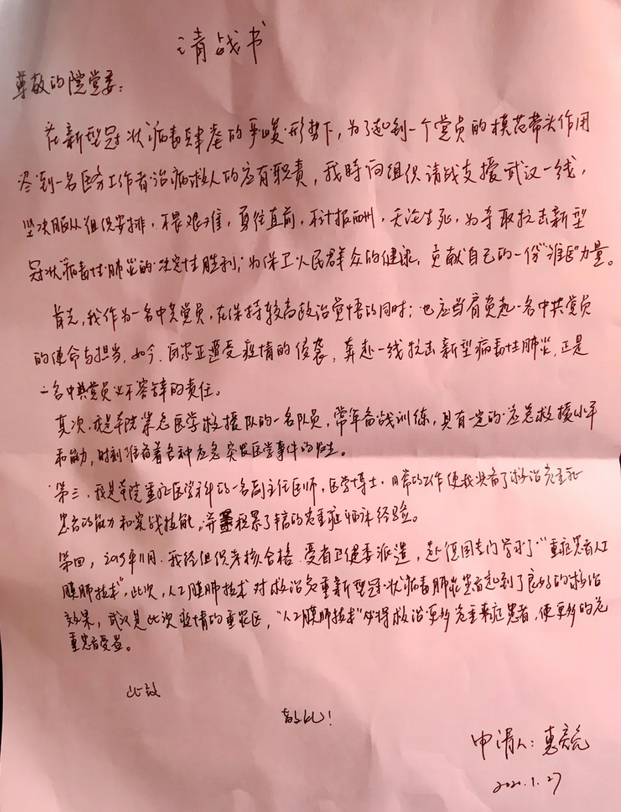 新冠肺炎疫情发生后,惠亮亮时刻关注着武汉的疫情防治工作,得知淮安要组建援湖北医疗队后,他毅然决然递上请战书。惠亮亮说:“国家正遭受疫情侵袭,正是用人之际,我作为一名医务工作者、一名共产党员,前往武汉一线抗击疫情,是我义不容辞的责任。”