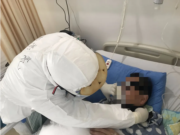 每次救助病患时,惠亮亮总是第一时间冲锋在前,把危险留给自己。在进入隔离病房的第三天,新转进一名重症肺炎患者,惠亮亮带领队员立即展开抢救。为了给患者戴好无创面罩,防止漏气,惠亮亮冒着可能被气溶胶感染的风险,近距离地俯身在患者面部上方,不断调试无创面罩与患者面部的吻合度及密闭性。