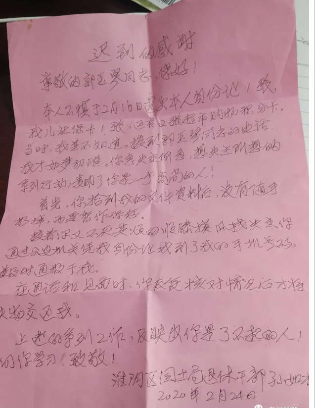 因为没有任何联系方式,捡了东西的郭玉琴,在经过一翻周折后,终于和失主孙如松取得了联系。看着自己失而复得的物品,孙如松提出酬谢,但被郭玉琴婉言拒绝了。思来想去,孙如松给区融媒体中心送来了一封信以表达他的感激之情。