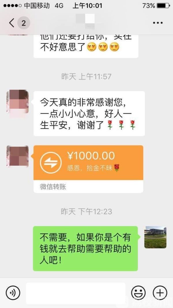 为了感谢拾金不昧的好人,周女士加了杨银飞的微信,转了一千元表示感谢,杨银飞拒收,并回复周女士,可以把这个钱捐给需要帮助的人。
