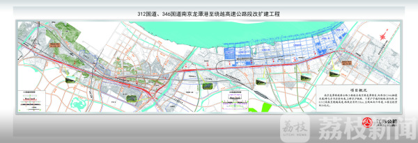 该项目采用主线高架桥快速路+地面辅路城市道路同步改造建设方案,工程起于龙潭港区一期大门,沿栖霞大道向西,跨越七乡河后向南,上跨京沪铁路,下穿沪宁城际铁路,之后路线折向西,沿312国道向西,路线止于绕越高速公路栖霞互通,线路全长14.882KM,其中主线高架快速路采用一级公路标准,双向六车道,断面宽度33.5米,设计速度100KM/H。地面辅道为城市道路标准,设计速度60KM/H。346国道段双向六车道,312国道段双向九车道。