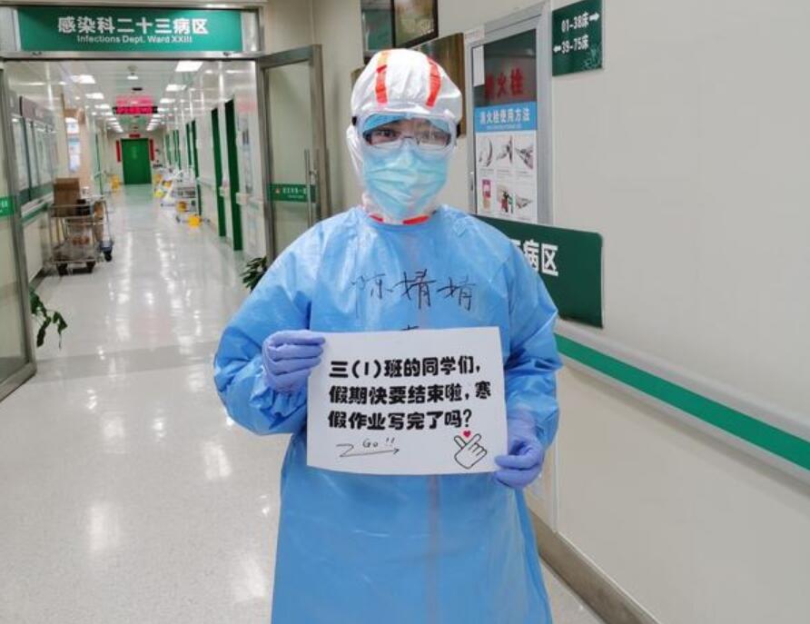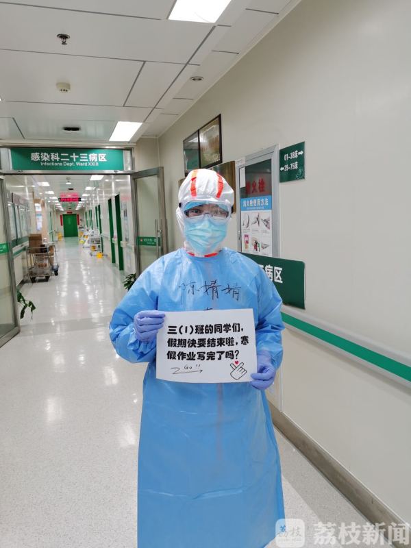 我苏网讯 3月6日,一幅来自武汉的照片上,一位穿着防护服的护士手里拿着一张纸条,上面写着:“三(1)班的同学们,假期快要结束啦,寒假作业写完了吗?”这是第五批江苏援湖北医疗队队员陈婧婧护士,写给南京金陵实验小学三(1)班的同学们的。