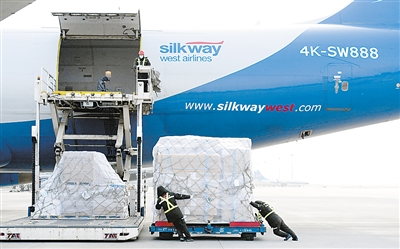 2月21日清晨8点半,在郑州机场34号货机位,阿塞拜疆丝绸之路西部航空公司一架货机正在装卸进口货物。马 健摄(人民视觉)