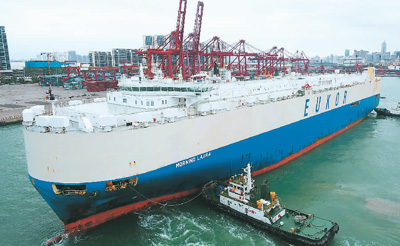 不久前,装载着来自卡塔尔的430辆平行进口汽车的滚装货船“劳拉”轮缓缓靠泊海口秀英港20号泊位,这是海南自贸区政策实施以来的首艘汽车外贸船。杨冠宇摄(新华社发)