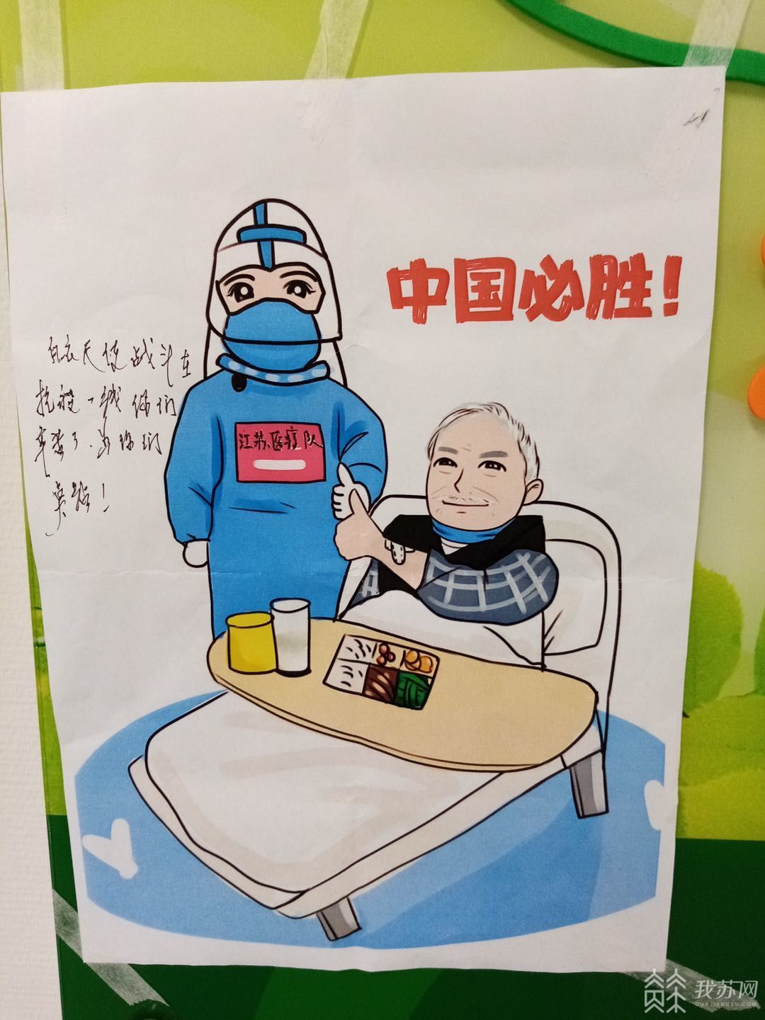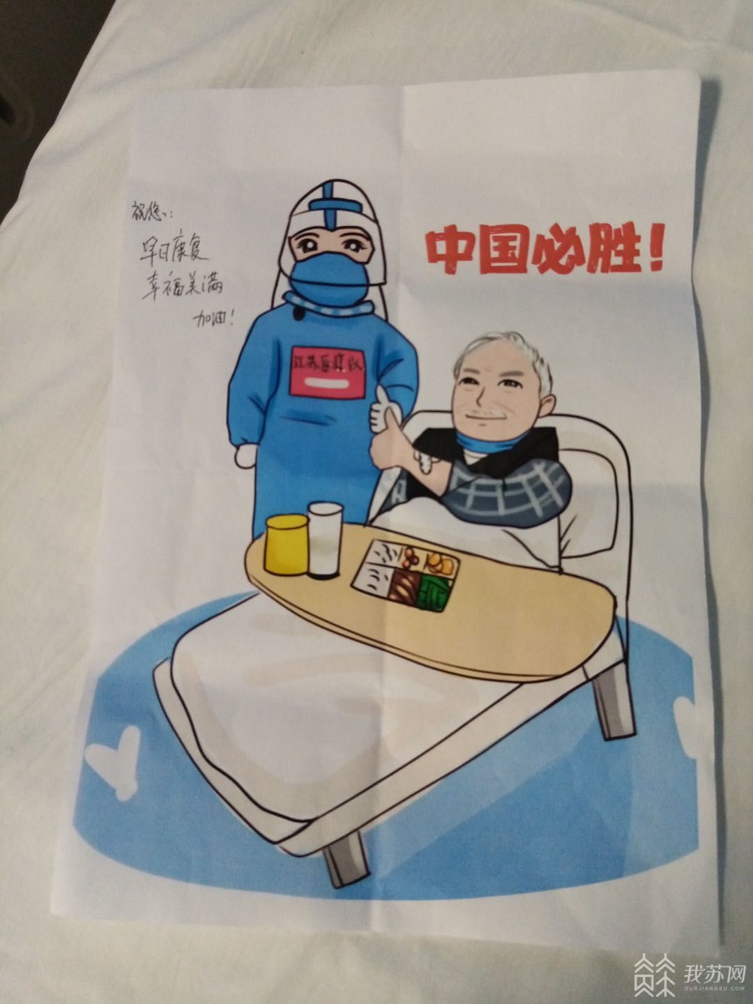 于是,我请人手绘了那张和老爷爷共同点赞的照片卡通图,我将卡通图打印了两份,将其中的一张卡通图送到老人家的手中,我们互相在各自的卡通图上写上了给对方的祝福语,老爷爷非常开心。