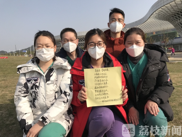 2月10日,南京市中西医结合医院唐晨虎、方小谦、曹晶晶、王慧敏和赵美五位同志随第三支国家中医医疗队(江苏)来到抗疫一线参与救治工作,他们视患者如亲人,留下了一段段杏林春暖的感人事迹。这一天,他们与南京的同事一起写了一首药名诗,纪念在这里的难忘岁月,并一起在方舱前合影留念。