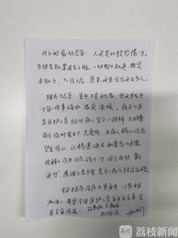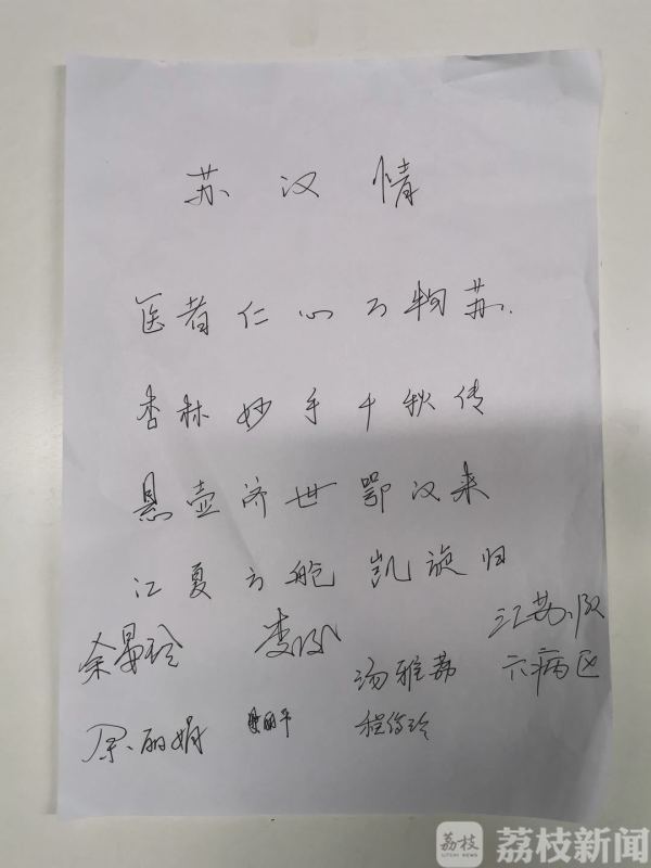 出院的患者,每个人都写了感谢信,有患者这样写道:“医者仁心万物苏,杏林妙手千秋传。悬壶济世鄂汉来,江夏方舱凯旋归。”