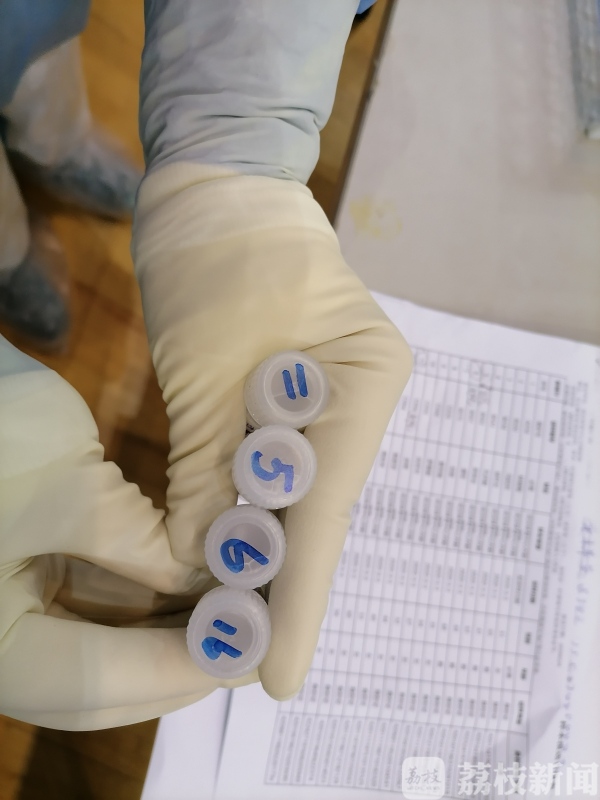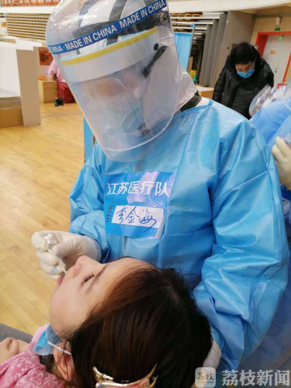 采集咽拭子之前,常规巡查出院的患者。E008床是一位64岁大妈,我们给她的建议是今天可以行走500米,明天逐步增加到550米,不能强求,以自己不累为准则,同时营养要均衡,生活规律,睡眠一定要好。我们也给了她联系方式,请她有问题可以随时给我们打电话,我们会在康复、治疗上给予她指导。这位大妈听了我们的话后,眼眶湿润了,深深地鞠了一躬,并且郑重地说,“谢谢你们,谢谢江苏的医生,武汉人民感谢您们。”