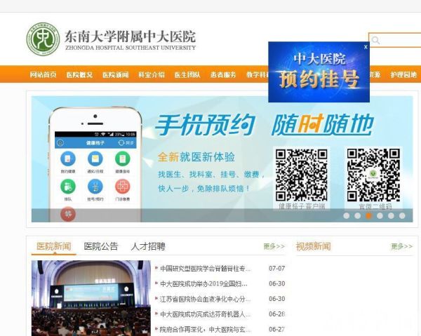 2. 手机微信:关注“东南大学附属中大医院”公众号(微信号:njzdyy),点击“自助服务”-“患者服务”- “服务窗口”-“预约挂号”进行预约。