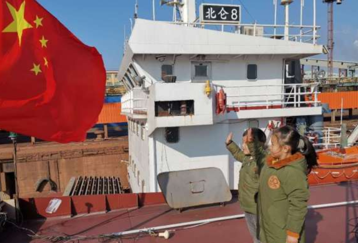 我苏网讯 3月9日一早,扬州仪征市实验小学学生张芷涵、张俊逸姐弟俩吃过早饭后,就迫不及待地来到“北仑8号”船头的甲板上,等待着学校线上升旗视频直播的开始。