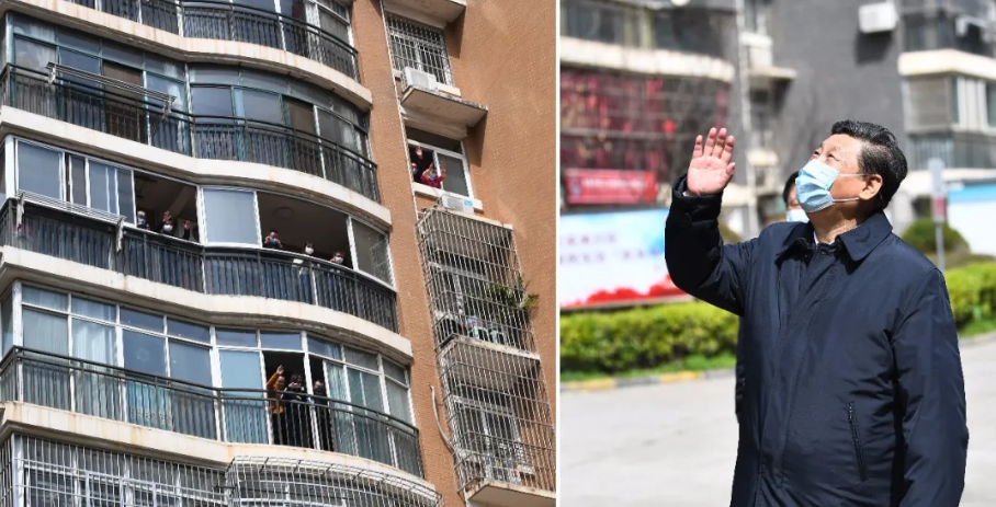 这是习近平在东湖新城社区考察时,向在家隔离居住的居民挥手致意、表示慰问。