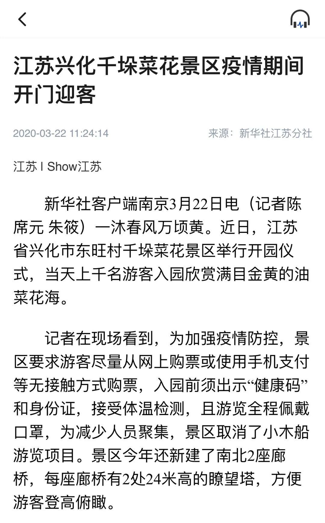 2020年3月18日,江苏兴化,游客戴着口罩进入千垛菜花景区。(新华社记者陈席元摄)