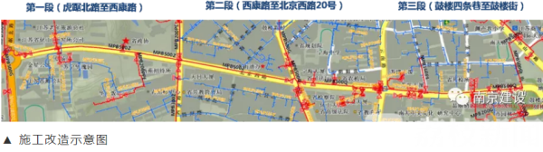 为降低施工对交通带来的影响,改造工程分为三个施工作业段同时推进:虎踞北路-西康路(760米)、西康路-北京西路20号(885米)、鼓楼四条巷-鼓楼街(665米)。