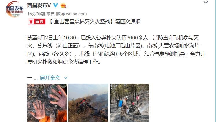 荔枝新闻讯 据@西昌发布V 4月2日消息,截至4月2日上午9:30,已投入各类扑火队伍3150人,消防直升飞机参与灭火,分东线(泸山正面)、东南线(电池厂后山片区)、南线(大营农场响水沟片区)、西线(经久乡)、北线(马道深沟)5个区域,结合气象预测指导,全力开展明火扑救和烟点余火清理工作。