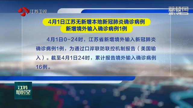 4月1日0-24时,江苏省新增境外输入新冠肺炎确诊病例1例,为通过口岸联防联控机制报告(美国输入)。截至4月1日24时,累计报告境外输入确诊病例16例。