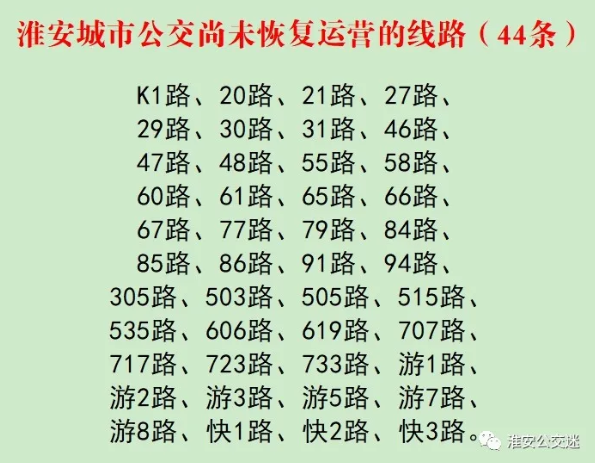 淮安城市公交尚未恢复的44条线路