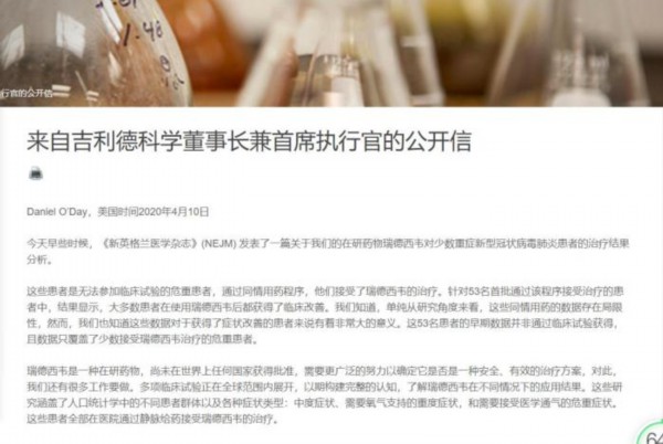美国时间4月10日,针对瑞德西韦的研究进展,吉利德科学董事长兼首席执行官Daniel O’Day也发布了一封公开信。
