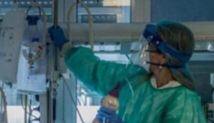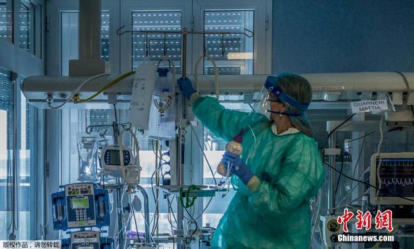 资料图:当地时间3月23日,意大利米兰东南部的克雷莫纳医院重症监护室,医护人员正在为感染新冠状肺炎的重症患者治疗。